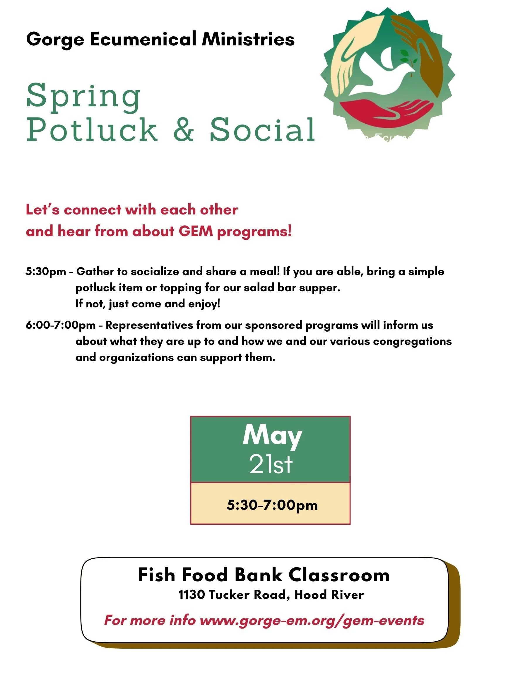Back to All Events G.E.M. Spring Potluck Social Thursday, May 21, 2026 5:30 PM 6:30 PM Google Calendar ICS