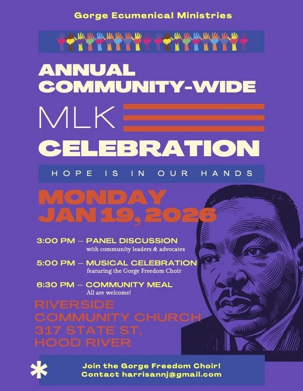 MLK Day Celebration Monday, January 19, 2026 3:00 PM 8:00 PM Riverside Community Church 317 State St. Hood River, OR USA (map) Google Calendar ICS Monday, January 19, 20263pm- Fireside Community Chats | 5:00pm- MLK Celebration w/ Gorge Freedom Choir | 6:30pm- Community DinnerRiverside Community Church 317 State St. Hood River, OR (map)